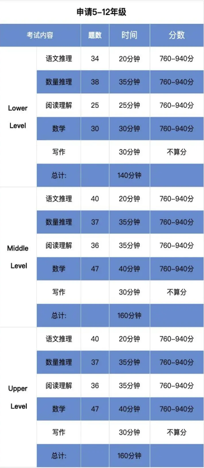 考试有5种类型题目:Verbal Reasoning、Quantitative Reasoning、Reading Comprehension、Mathematics Achievement、Essay(不计分,但会被发送给学校,供学0校录取参考。2页纸不限字数)