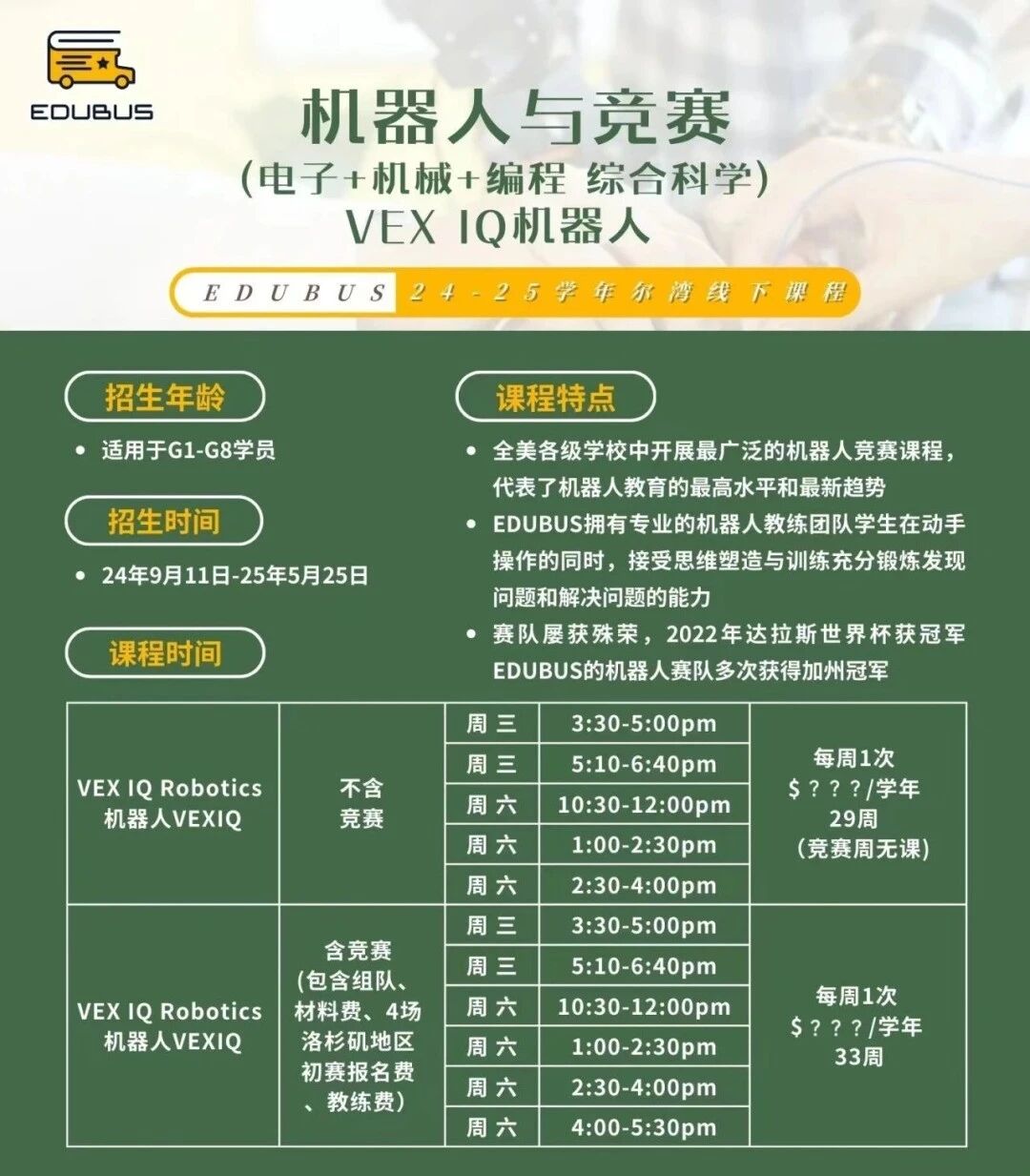 EDUBUS为尔湾孩子推出的机器人与竞赛 课程涵盖了电子、机械和编程等多种领域,重在培养学生的综合能力和科学素养,是USA公校和私校中开展最为广泛的机器人竞赛类课程!